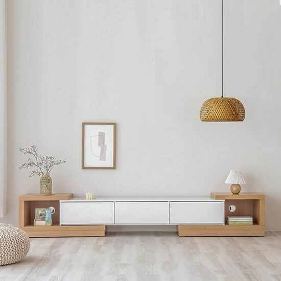 퍼리든 센디 거실장의 좁은 폭과 낮은 높이는 거실 공간의 활용성을 더욱 살려주며 좌우 각 사이드 장에 전선홀이 있어 깔끔한 사용이 가능합니다.